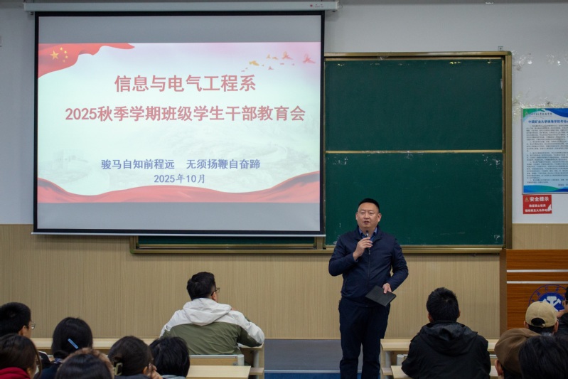 接着,许新富结合学院发展历程与学生培养成果出发,从“认清形势、正视问题、扛起责任”三方面展开教育指导。他指出,当前高等教育面临生源结构调整挑战,信电系正朝着“扩大办学规模、拓展高水平培养”的方向迈进。分享了学长学姐“教室内备考、刷题”的拼搏场景,更印证了“基础打牢、奋斗在平时”的重要性——学生干部作为班级“火车头”“领头雁”,需率先树立长远目标,既要应对全国范围内的考研、考公与优质就业的竞争,更要避免“逃课、宿舍沉迷游戏、躺平”等不良现象。针对现存问题,许新富以数据作警示:近几届学生中,约6-8%面临学籍降级、转专业或退学风险。他强调,这些问题并非“设限所致”,而是在部分班级中存在“负面传承”,如学习敷衍、考试松懈、上进心不足等。对此,他希望学生干部需主动纠偏思想,脚踏实地,挑起责任与担当:既要严守国家法律法规、校规校纪与社会公德,杜绝“带头违纪”,更要聚焦班级建设,常自问“为班级建设、学风建设、考风建设的营造做了多少事、帮了多少忙”。通过谈心谈话、交流帮扶、宿舍对接等,解决宿舍安全用电、宿舍禁烟、人际关系以及心理疏导等实际问题,在能力培养与理想追求上,许新富提出明确要求:思想层面,要将“爱党、爱国、爱社会主义”内化于心、外化于行,敢于对不良行为说“不”;行动层面,要推动理想与实践结合,后续将通过朋辈引领宣传与优秀学子宣讲活动,以身边榜样激发同学斗志,平衡短期目标与长远发展,鼓励大家积极参加课外文化体育活动,避免单靠成绩进行性评价,实现德智体美劳全面发展。