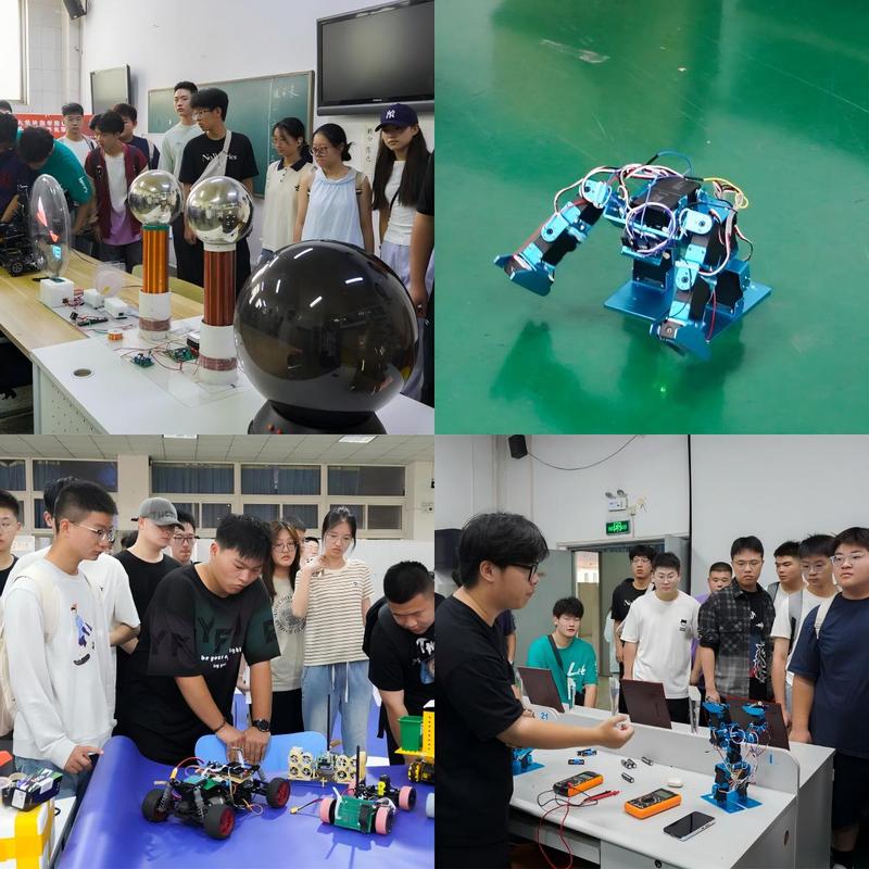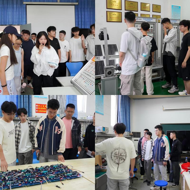 活动中,新生们分批参观了智能机器人、新能源技术、电子电路实践等多个展区:在智能机器人展区,蓝色机械臂、自主移动小车等学生科创作品整齐陈列,讲解员现场演示了机械臂的抓取动作,不少新生俯身观察设备的电路与结构细节;在新能源技术区,大家站在电动汽车动力系统演示台、风光互补发电实训装置前,听学长学姐讲解电池管理、清洁能源转换的专业原理;电子电路实践区的面包板、万用表等器材,则让新生直观感受到了专业实践的动手场景。